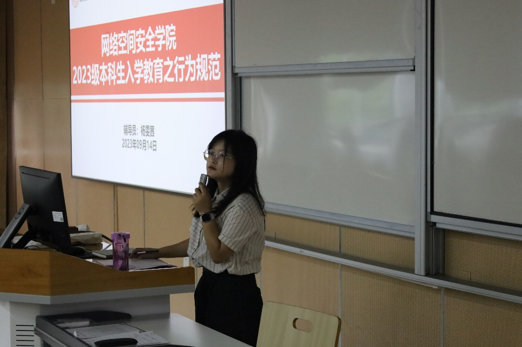 杨雯茜老师首先进行校园安全和行为规范教育,呼吁新生在社交网络中要树立良好的网络形象,学好用好专业知识,做一个守法守信有公德的好网民。随后,杨老师对学生工作的开展进行了介绍,鼓励同学们学会自主寻找信息,主动打破信息差,从而更好的规划自己的大学以及人生目标。